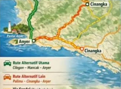 Adapun terdapat empat jalur alternatif menuju kawasan wisata Anyer–Cinangka yang dapat ditempuh masyarakat.