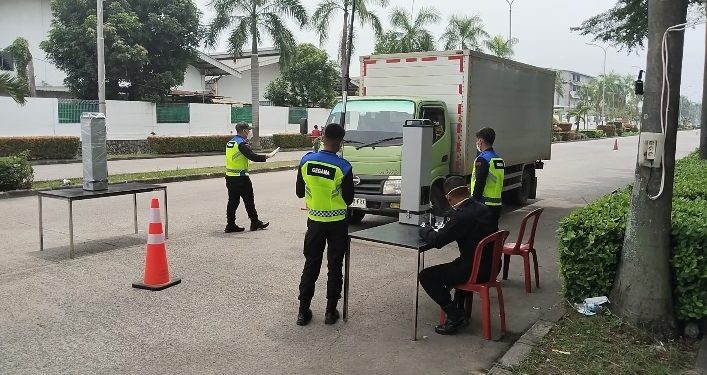 Pantauan walan.id di Kawasan Industri Modern Cikande, Kabupaten Serang terlihat petugas dari satuan Brimob berjaga dan memperketat pengendalian keluar masuk mobil barang untuk mengantisipasi cemaran radioaktif cesium-137.