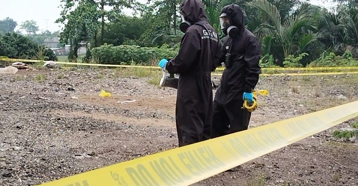 Selain itu, Gegana Polri melakukan pembatasan dengan garis police line dengan peralatan lengkap dan melokalisir paparan di area tersebut.